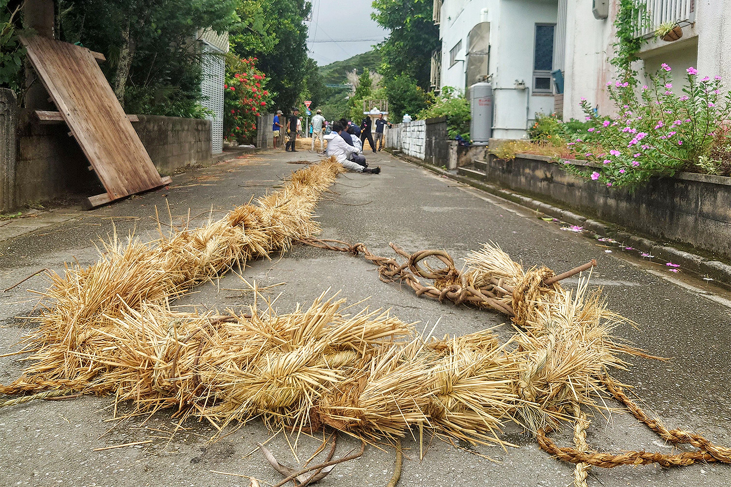 道に敷き詰められた稲わらで大綱を作り、儀礼の後、東西にわかれて綱引きが行われます。